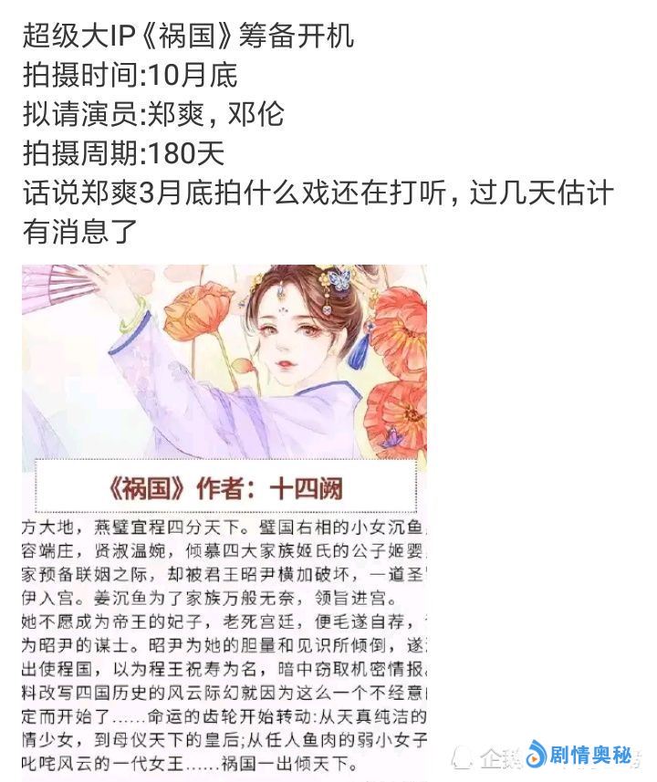 而据悉,目前有一部改编自同名IP小说的新剧《祸国》正在筹备当中,暂定在2019年10月底开机拍摄。这部剧是古装题材,而男主邀请的是邓伦出演。另外,这部新剧与邓伦合作的女主,邀请的是当红小花郑爽出演。