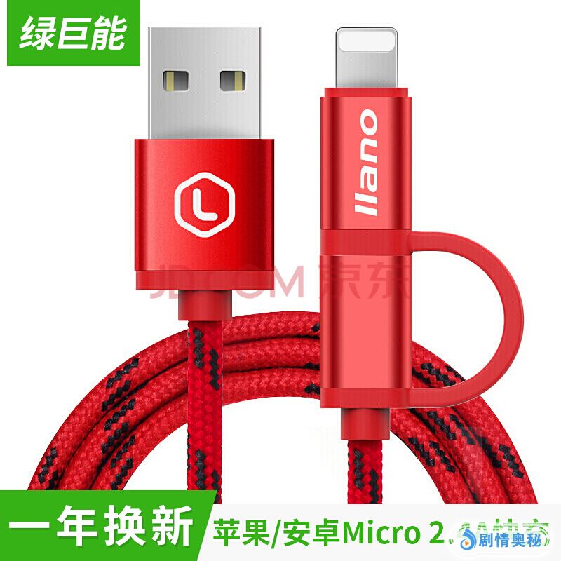 绿巨能(llano)数据线 二合一 快充适用苹果8/7 iPhone6s/6 plus/5s usb安卓 华为/三星/小米等手机充电器线
