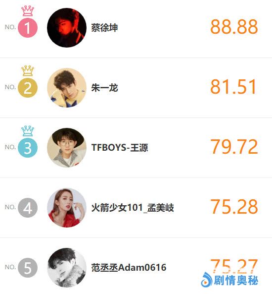 目前势力指数最高的五位娱乐圈明星依次是蔡徐坤、朱一龙、TFBOYS王源、孟美岐、范丞丞,其中排在榜首的蔡徐坤数据存疑,谦逊温和的他排第二,用心演绎小三爷吴邪的朱一龙赢得“小笼包”力挺,此外放出新歌的TFBOYS王源挺进前三,指数上升的孟美岐范丞丞排在第四第五。
