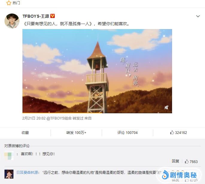 再说挺进前三的TFBOYS王源,本周小源发布了最新单曲《只要有想见的人,就不是孤身一人》,截止小编发文时间,这条动态获得了超过100万的转发、超过10万的评论,以及超过32万的点赞,“小汤圆”的表现尤为出色,有众多粉丝支持,相信18岁的王源可以在2019年再攀事业巅峰。