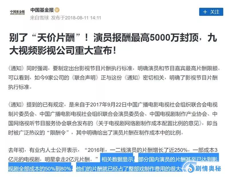 根据中国基金报于2018年8月11日发布的《别了“天价片酬”!演员报酬最高5000万封顶,九大视频影视公司重大宣布!》一文内容,“部分国内演员的片酬甚至已经达到影视剧全部制作成本的50%-80%。”