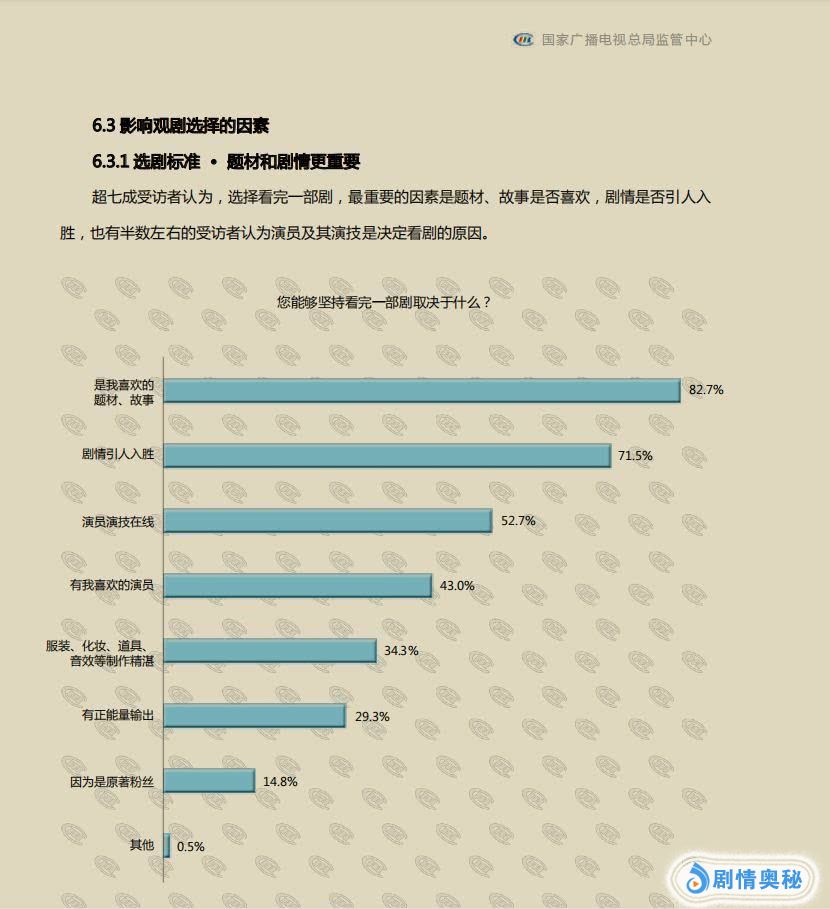 最后,作为内容最终的消费者,用户正在变得愈发“挑剔”,他们是否愿意在平台产生消费行为,极大程度上取决于平台优质内容的储备情况。根据国家广播电视总局监管中心发布的《2018网络原创节目发展分析报告(网络剧篇)》受众属性分析显示,在影响观剧选择的影响因素中,82.7%的受访者认为题材、故事是最重要的,其余均是次要因素。