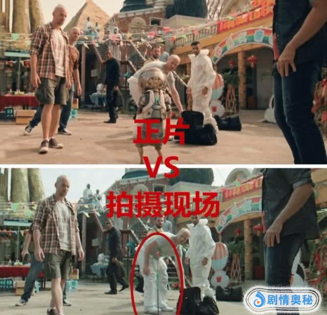 通过上图的对比大家可以发现,电影中的猴子“欢欢”则是无实物表演,直接用一根杆子代替,等电影拍摄好了之后,导演再通过后期制作完成,把猴子给放上面去,最后的效果也是惟妙惟肖。
