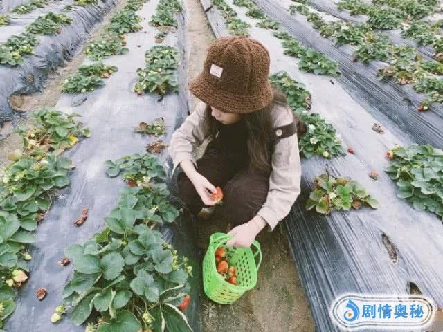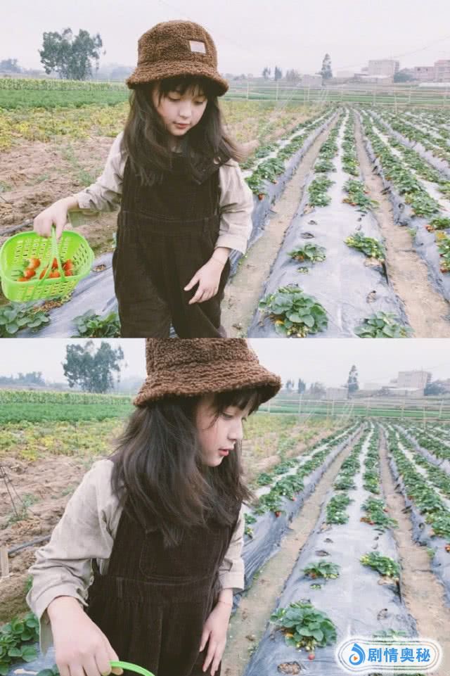照片中9岁的刘楚恬长发披肩,头戴灰色小帽子,身穿浅灰色打底衫搭配深灰背带裤,一身装扮也是十分洋气。一手拎着一个绿色小篮子,蹲在一片草莓地中摘草莓的刘楚恬也是十分认真。