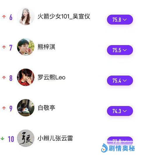 再看艺人势力榜单后五名,排在TOP10后五名的艺人依次是吴宣仪、熊梓淇、罗云熙、“小白”白敬亭,以及频频空降热搜的张云雷,其中与宋茜、徐开骋合作高人气大剧《掮客》的罗云熙冲至榜单第8名,他的势力指数还有持续上升的趋势。