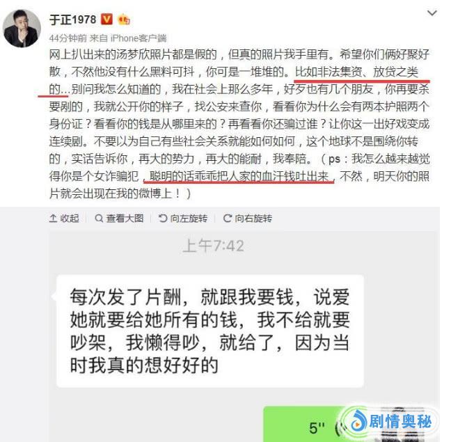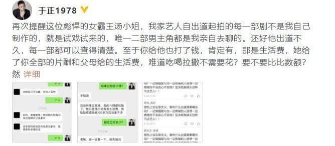 还说如果不复合就会毁了男的演艺事业,还说会爆料,但是根据艺人说的那些料不是真的。当于妈开始正义附体的时候,将事情也放到了网上。之后就开始一路和这个艺人前女友杠上了,而且如今也是爆料的越来越精彩了。还晒出了很多聊天记录,给大家一种很实锤,没有虚构的感觉。