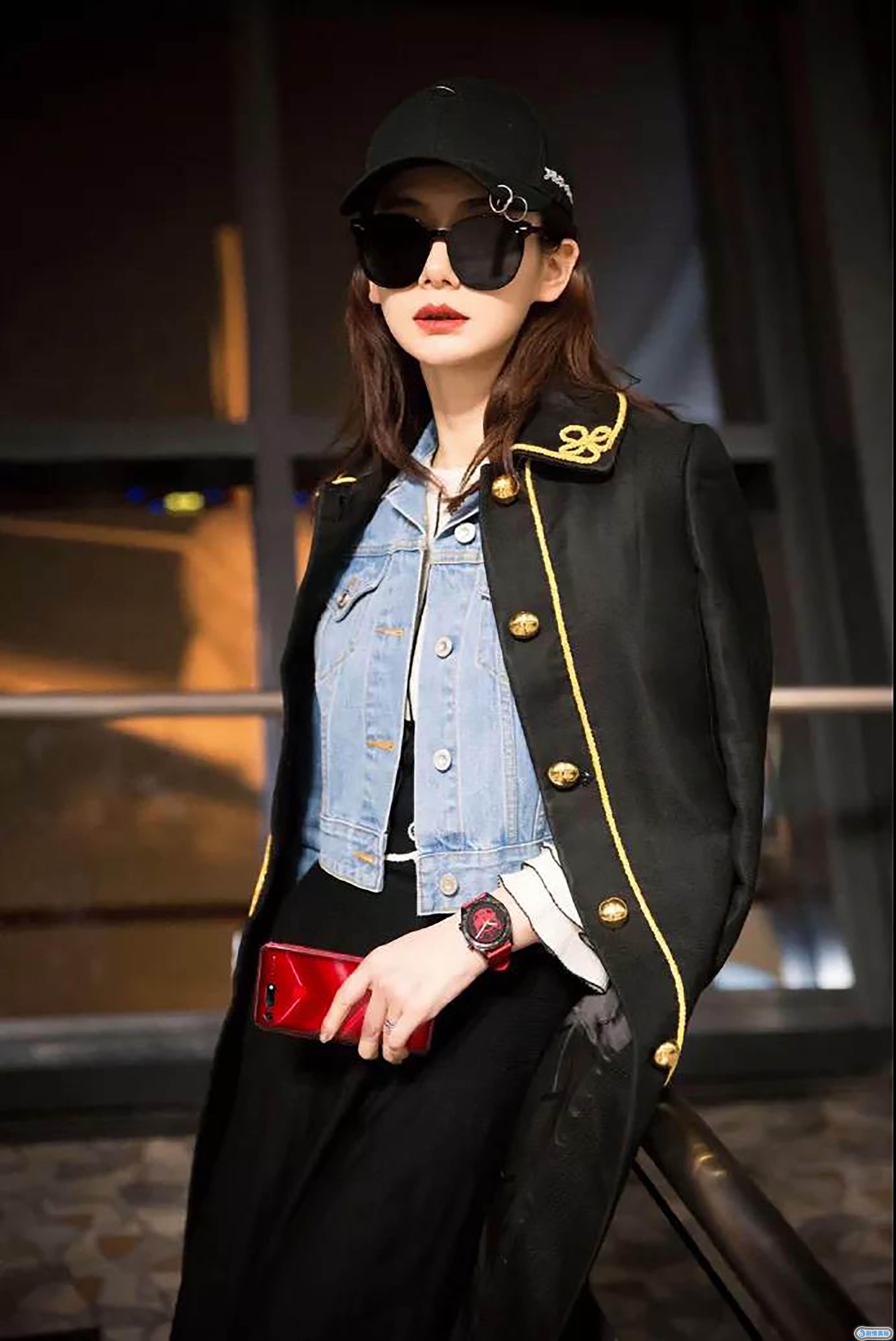 不过这也是在侧面反应出她是真的很敬业啊,头戴一顶黑色鸭舌帽,配饰选择了一副黑色眼镜,然后内衬一件白色衫,再搭一件牛仔衣与一条黑色的中裙,最后披上一件黑色配金鎏边的长衣,再选择一双白鞋跟白包包衬托整体。