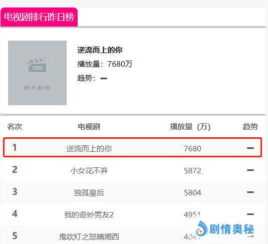 这是榜单前五名,目前该剧网络人气最旺的五部剧依次是《逆流而上的你》、《小女花不弃》、《独孤皇后》、《我的奇妙男友2》,以及《鬼吹灯之怒晴湘西》,其中潘粤明新剧《逆流而上的你》凭借7680万播放量的豪华登顶,该剧剧情还在昨晚空降热搜榜首,超高人气值得肯定,《小女花不弃》和《独孤皇后》两部周播剧位列前三,剧中饰演独孤皇后的陈乔恩,以及饰演花不弃的林依晨发挥出色,已经收官的《鬼吹灯之怒晴湘西》排第五,该剧今晚的播放量将在周二更新。