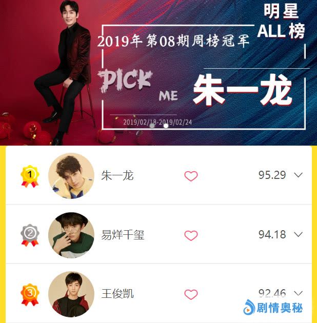 我们先看榜单前三,在明星热度周榜中,热度指数最高的三位娱乐明星依次是朱一龙、TFBOYS易烊千玺、王俊凯,其中实力派男神朱一龙蝉联第一,2月月榜已经是他的囊中之物,表现出色的四字弟弟易烊千玺稳居次席,排在第三名的是易烊千玺的好兄弟王俊凯。
