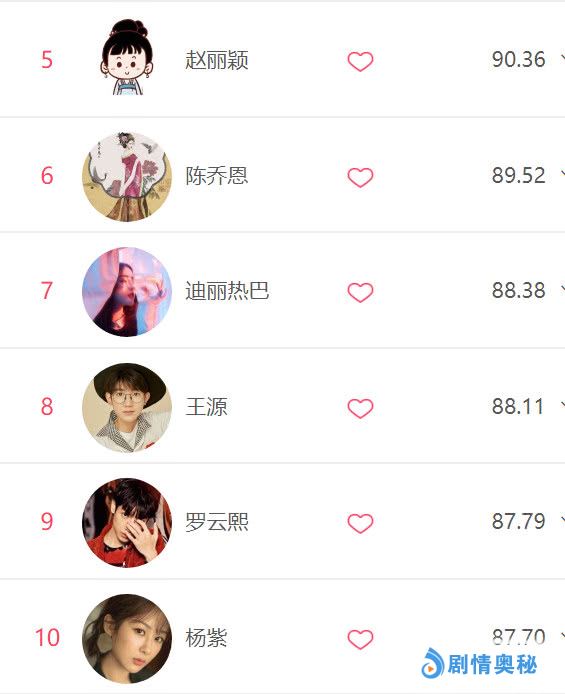 我们接着往下看,排在第4~第10位的娱乐圈明星依次是小鲜肉蔡徐坤、赵丽颖、陈乔恩、迪丽热巴、王源、罗云熙,以及杨紫,其中没有新剧在播的赵丽颖稳居前五,在《独孤皇后》中大秀演技的陈乔恩排第六,当红男演员罗云熙的表现同样出色,安心拍戏的他排第九,紧随其后的是我们熟悉的“小猴紫”杨紫。