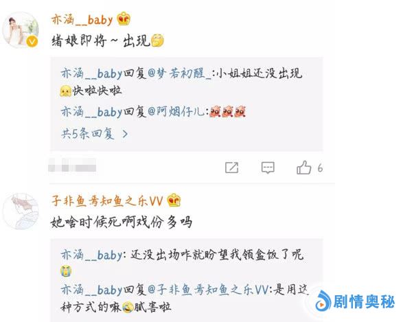最近亦涵在微博透露自己在剧中出演的角色绪娘即将上线了,让人出乎意料的是下面有个网友问了一句,她啥时候死啊戏份多吗(意思就是你什么时候领盒饭下线啊)?结果这让美女很是伤心啊,这还没出场就被盼望领盒饭了。
