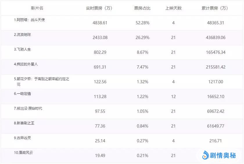 今天排在榜首的依旧是由罗伯特·罗德里格兹执导,罗莎·萨拉扎尔、克里斯托弗·瓦尔兹等主演《阿丽塔:战斗天使》,单日票房四千八百多万,而且优势明显,上映4天累计票房已经来到4.83亿。