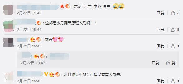网友们纷纷评论,看到《水月洞天》原班人马龙婆、甜雪、童心、豆豆重聚很开心,只可惜童大哥没来,但是紫霞仙子来了。原来陈法蓉、蔡少芬、张晋、郑佩佩等人03年一起拍过一部《水月洞天》的连续剧,这是他们16年后的再度同框。怎么能让粉丝不激动呢?