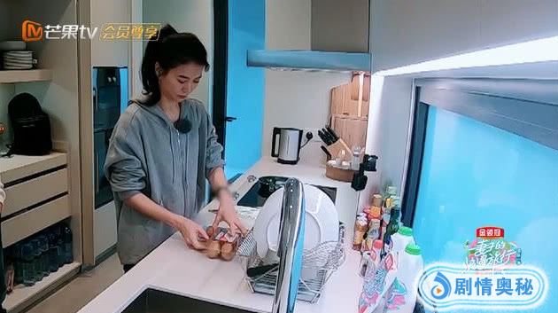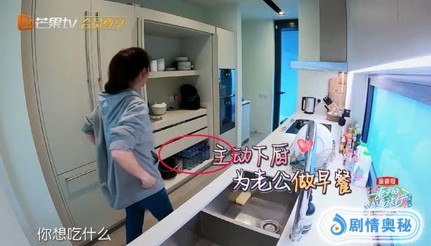 而且在节目中她亲自下厨给老公做早饭吃,大家发现了,其实家里厨房还是比较小的,但是你发现这一细节吗?虽然不管是家里的大小,各方面物品都收拾的非常干净整齐,让人感觉和很舒服,在厨房的柜子下面还放着一排矿泉水,说明对生活品质要求很高。