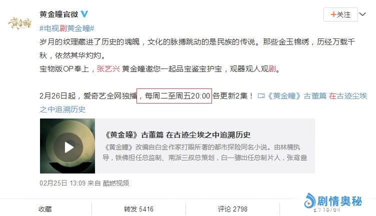 《黄金瞳》官微官宣自2月26日起,每周二至周五每晚更新两集换言而之就是一周更新8集的剧情,平均一天一集的剧情,粉丝们都觉得太有良心了。而且《黄金瞳》的剧情不拖沓,全员演技在线。最重要的是张艺兴和李荣浩这对“不荣艺”组合也出现在了剧中引起了网友们的热议。在第一集中,张艺兴和李荣浩都是好朋友还在酒吧上共饮交杯酒同框唱歌。