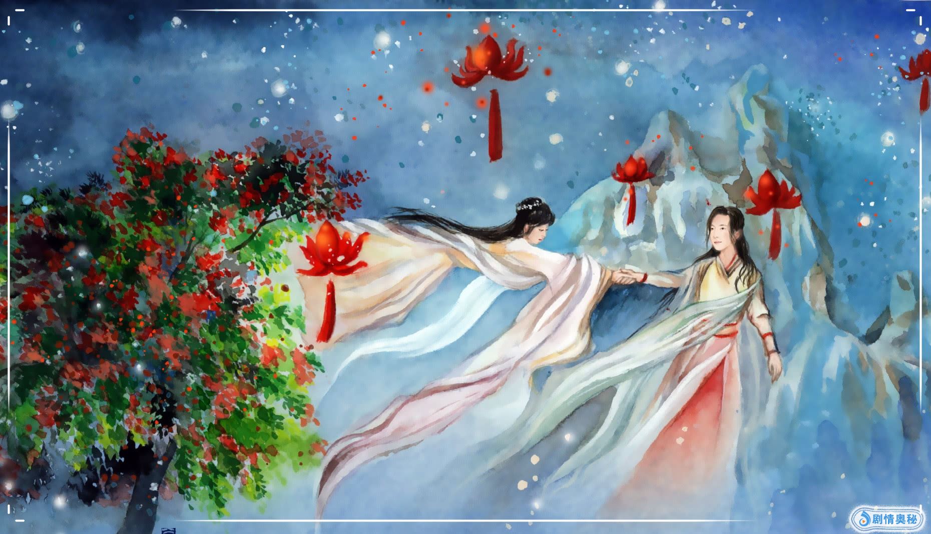 首先来说这第一幅吧,景色十分的美丽呢,在这张插画的左面的部分是一颗树,而且这棵树也十分的茂盛,上面有绿色的叶子和红色的花朵,看着特别的挺拔,同时在这幅插画中还有两个人人物,看着服装来说的话,是一位男子和一位女子,而且这名男子正在拉着女子的手在转圈圈,喜欢看仙侠剧的对于这幅插画对应的电视剧就不陌生了
