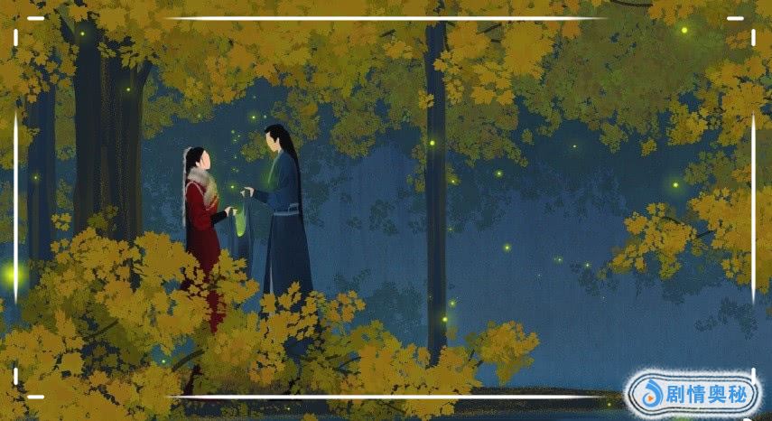 再接着这第三幅插画了,这是在一片浓密的树林当中,这树木十分的茂盛,其中有两个人站在了这茂密的树林中,那女子穿着红色的衣服,男子穿着蓝色的衣服,两个人的周围还有飞舞的绿色的萤火虫,在两个人的中间也有很多,同时两个人还相互对望着,这样的一个场景确实觉得很是美妙呢,如此美丽的景象,想必很多的人已经猜出来了吧