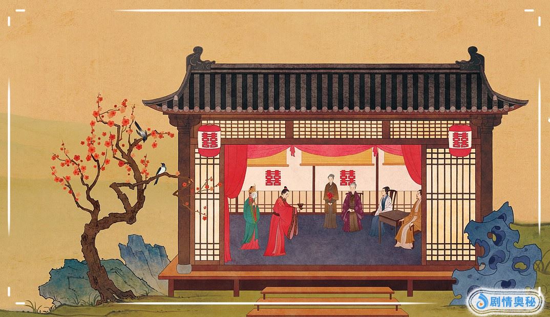 然后就是第二幅了,这幅画同样也是很喜庆的,是一个结婚的场景,在房间的里面还可以看的到贴着大大的喜字,连门口的灯笼上也是有的,一对新婚的人正在向厅前的父母拜别着,本文由影视速览作者独家原创,未经授权不得转载。旁边还有一位年纪稍长的一位,这红男绿女的衣着很是醒目的,门庭外开着红色的花朵的树上还有一直喜鹊呢,这部剧还是今年比较火热的一部了,你们猜的出来这幅插画是哪部电视剧了么