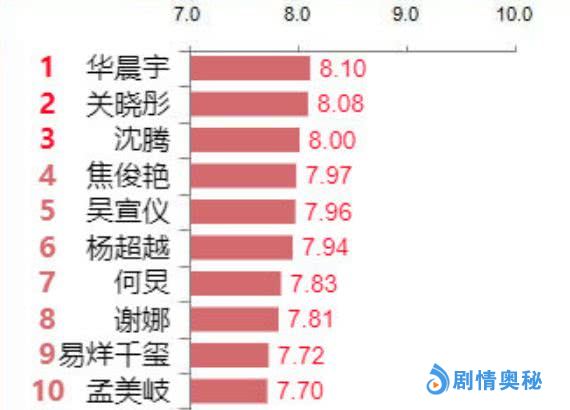 先看榜单前五名,目前热度最高的五位综艺嘉宾依次是“花花”华晨宇、关晓彤、沈腾、焦俊艳、吴宣仪,其中榜单前三名全部来自《王牌对王牌》节目组,看来该综艺的走红不是偶然,此外《快乐大本营》“太阳女神”谢娜排第八,她还加盟了综艺《妻子的浪漫旅行》,而四字弟弟易烊千玺进前十,他是目前TFBOYS组合唯一一位进前十的成员。