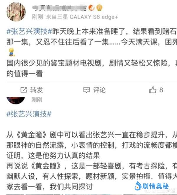 张艺兴在剧中出演男主角庄睿,随着这部剧的播出,张艺兴的演技也遭遇了冰火两重天的评价,今天张艺兴演技出现在了微博热搜榜上,对于张艺兴在《黄金瞳》中的演技,他的粉丝持赞赏状态,有粉丝留言说从在剧中可以看出张艺兴一直在努力,从他的眼神的自然流露和各种小表情的控制,打戏的流畅度都能感受到他的努力。其实从剧中可以看出,张艺兴在剧中的演技还算比较自然,而且很多细节也能做到位,能给人一种很强的代入感,也难怪他的粉丝给出很高的评价。