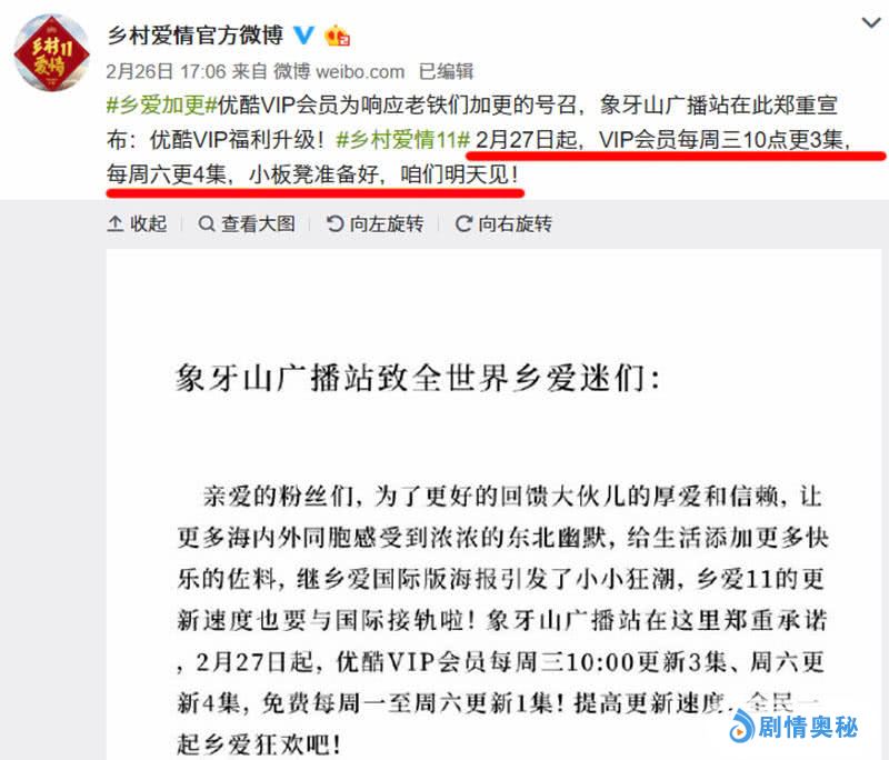 2月26日,《乡村爱情11》在官方媒体平台再发重磅消息,称该剧的网络独播平台为了响应会员加更的要求,播放档期再次修改,由原来的每周六10点更新6集,改为每周三10点更3集,每周六更4集,也就是说平台会员一周可多看一集了,当然非会员还得每天一集的干熬。