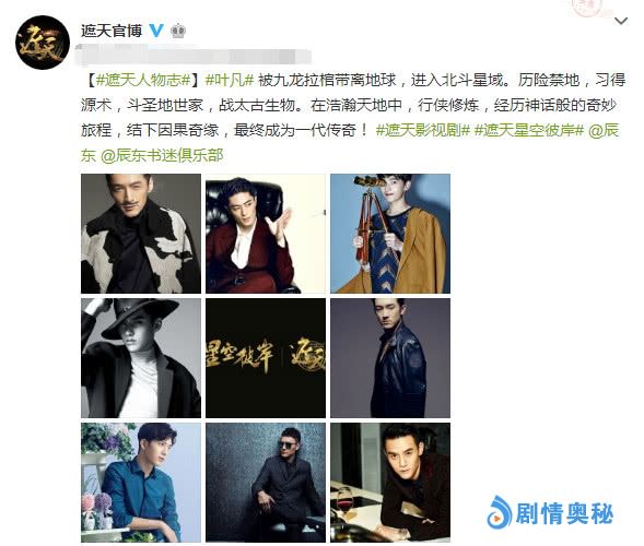 男主角叶凡,看似是一位普通人,其实是荒古圣体,历经奇事,历险禁地,结识星域各族,以力证道,成就天帝果位,平定六大禁区,取得万族认可,成为宇宙共尊的故事。因为他在书中被描述为长发披肩、面相清秀、身强体健,所以选择演员首先要在外貌和气质上与其有相似之处,还要有丰富的表演基础。官微放出了8位待选演员,分别是:胡歌、霍建华、杨洋、吴亦凡、林更新、井柏然、冯绍峰、王凯。其中胡歌呼声最高。