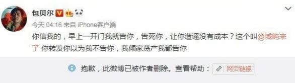 这边张嘉倪风波未平,同样因为参加《妻子的浪漫旅行2》而人气火爆的包贝尔也遭到了质疑,有网友转发了一篇名为《包贝尔:千万别辜负那个陪你吃苦的女人》的文章,指责包贝尔为渣男,孕期出轨,利用婚姻感情骗粉丝,话语十分难听。而包贝尔也第一时间回怼:“早上一开门我就告你,告死你,让你造谣没有成本?我倾家荡产我都告你”。可以看得出来,对于网友的诋毁包贝尔非常的愤怒,不少粉丝也支持包贝尔维权,网络不少法外之地。