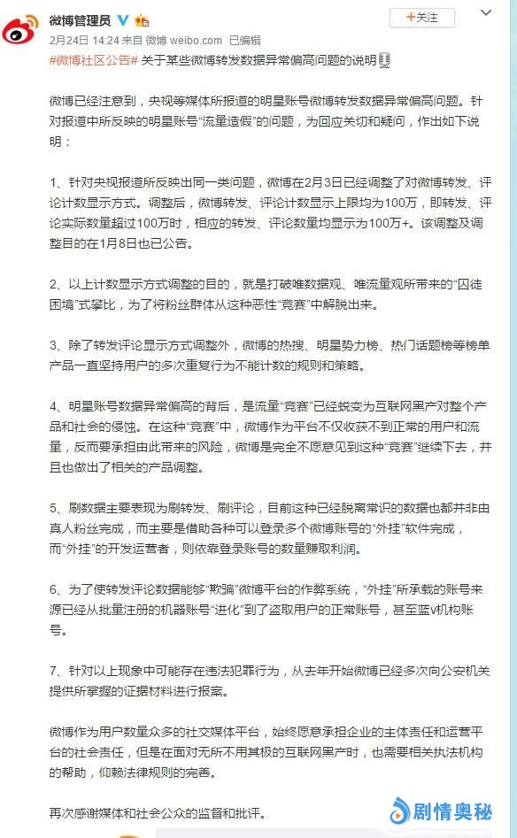 从2005年“超女”选秀至今,中国的偶像产业发展不过十多年,相比国外的成熟模式,在市场监管上仍有许多空白与欠缺。2月24日,微博已经回应,调整对微博转发、评论计数显示方式。乱花渐欲迷人眼,流量造假获得的利益只是一时的,虚幻的数据终究只是镜花水月、海市蜃楼,只有真正的原创优质内容才能长红常青。
