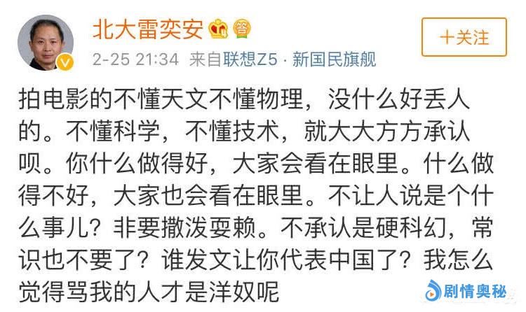 雷奕安教授发表了两篇文章把自己推上了风口浪尖,不少《流浪地球》的影迷开始痛批教授故意黑《流浪地球》,还有网友diss了雷奕安教授是洋奴!雷奕安面对着网络暴力并没有示弱而是发文反击网友,雷奕安发长文回击网友称:《流浪地球》的导演郭帆不懂得天文和物理,没什么好丢人的,不懂科学技术就大大方方承认。非要撒泼耍赖?《流浪地球》连常识都不要不能称为硬科幻!骂我的人才是洋奴!谁让《流浪地球》代表中国了!