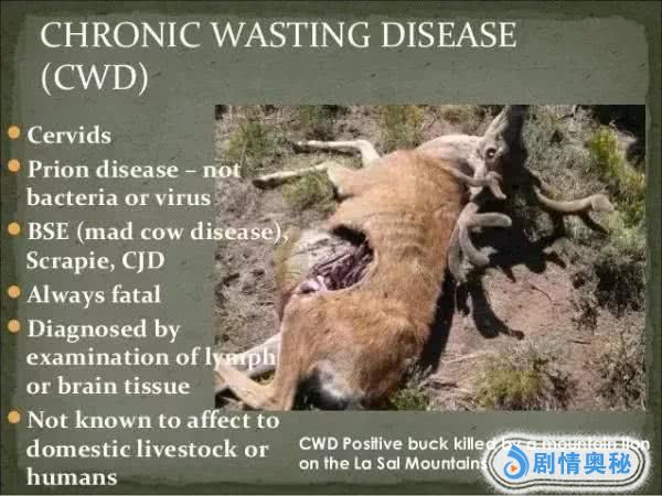 这种疾病被医学家们称为慢性消耗性疾病。这种疾病的出现就是可以诱发身体里的蛋白质发生变异,当大量的蛋白质产生感染的时候整个动物的脑子就会变得非常的重而发生一些不符合常理的行为。这些感染病毒的野生鹿类会发生体重骤减,反应迟钝,等行为同时还会有过度流口水和强攻击性。