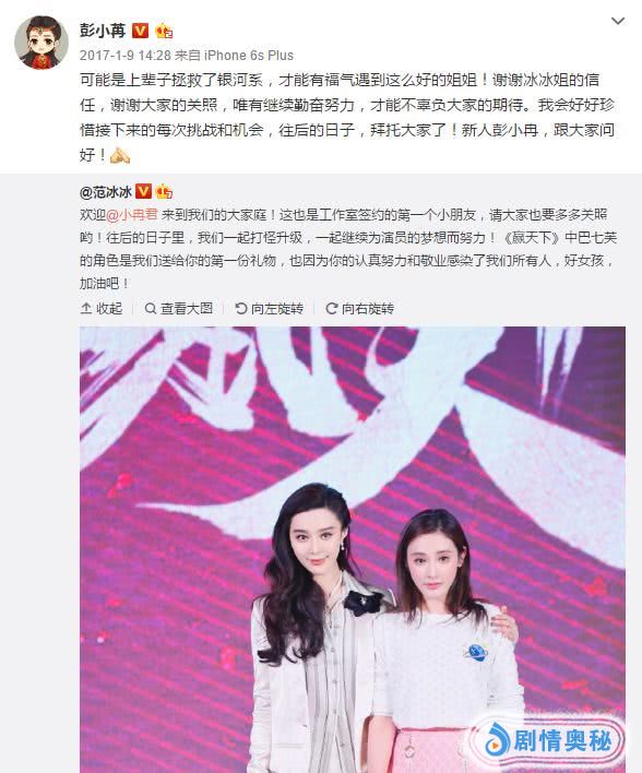 签约之后,范冰冰可以称得上是力捧她了。在《巴清传》中给了她巴清妹妹巴七芙这个戏份颇重的角色,在片场也是处处关照她,还促成了彭小苒和剧中女二号马苏的好姐妹关系。当然这部剧如今因为各种不可描述的原因是肯定播不了了,彭小苒也错过了一次相当好的露脸的机会。