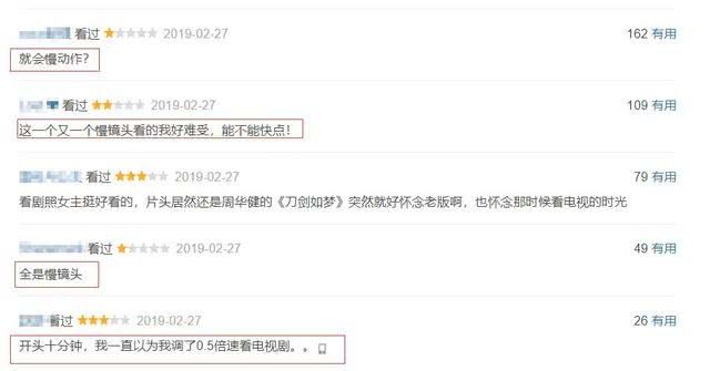 另外,电视剧集数多,注定了剧情进展缓慢,新版《倚天屠龙记》的确是如此。打斗场面确实是不少,但接连不断的慢镜头能让人急死,部分网友吐槽,以为是用0.5倍速看的剧。