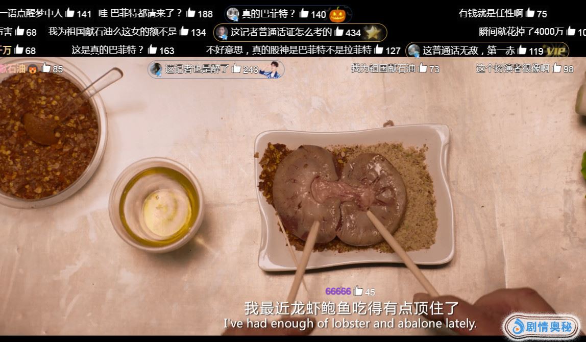可是在吃饭的时候,这个腰子是什么情况?随便,看上去有点恶心,不知道大家是怎么样的感受,而且让里面的主人公也难以下咽,这个时候很多网友都在看上面的弹幕。