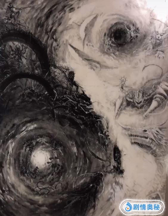 这张图中,整体来看非常的抽象,并没有具体的形状,简单的黑白组成非常大气的感觉,而且还有各种层次感,看起来很胸围壮阔,能大概看出龙头和身体,而且看起来就好像科幻电影一样,各种神秘的特效组成的,不过当镜头拉近以后却发现,这些黑乎乎的东西中,还有很多的细节都是不能忽视的,画的也是很抽象,是神话故事中的动物,没有具体的形状,完全是依靠想象力画出来的!
