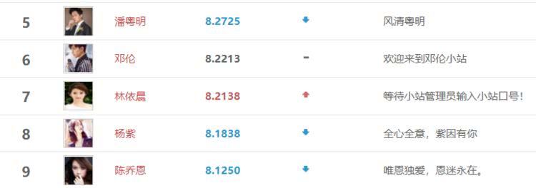 我们接着往下看,排在后五名的电视演员依次是潘粤明、邓伦、林依晨、杨紫,以及陈乔恩,其中除了领衔主演《小女花不弃》的林依晨以外,潘粤明、杨紫、陈乔恩的热度全部下滑。以上便是本期电视演员热度评分榜单的全部内容了,你最喜欢其中哪位演员呢?