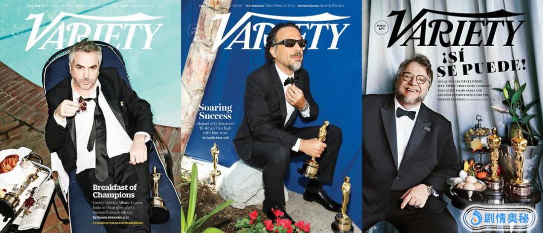 吉尔莫·德尔·托罗(右)执导的《水形物语》在夺得第90届奥斯卡最佳影片、最佳导演奖等四项大奖后,荣登《综艺》杂志封面,与冈萨雷斯·伊纳里图(中)、阿方索·卡隆(左)的封面并列。
