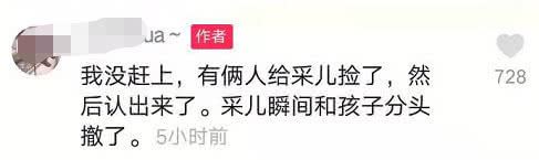 而面对被网友误解的应采儿,很快拍摄者也站出来为她澄清表示“没有乱丢垃圾了,是采儿手中的卡片掉了,有两个路人给采儿捡了,然后认出了她”。所以,为避免引起不必要的轰动,应采儿也是匆忙和孩子分头撤走了。
