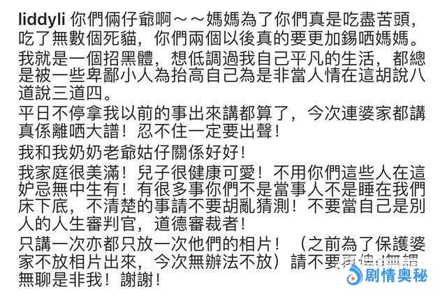为了澄清与家婆关系良好,李悦彤之后更少有的在社交平台上晒出了与家婆的合照,还表示自己为鲍伟业与儿子吃尽了苦头。李悦彤自小三事件之后就一直成为媒体的关注点,她承认自己是“招黑体”,这一次忍不住发声是因为不满自己家婆被媒体做新闻,更表示之前不放与家婆的合照是要保护家婆,不过她也表示这是自己最后一次澄清与家人的关系,也是最后一次晒出合照。