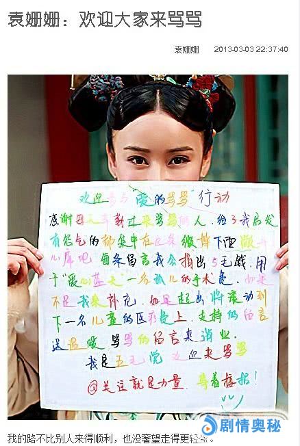 在沉默了一段时间后,袁姗姗在微博发起了公益行动“爱的骂骂”:即24小时内,在那条微博下出现的每一条留言她都认捐5毛钱,作为北京一家残疾孤儿康复机构的手术费。最终,“爱的骂骂”筹集到了50693.5元,帮助了4名残疾孤儿。「反正是挨骂,不如用最积极的方式迎接骂声。」
