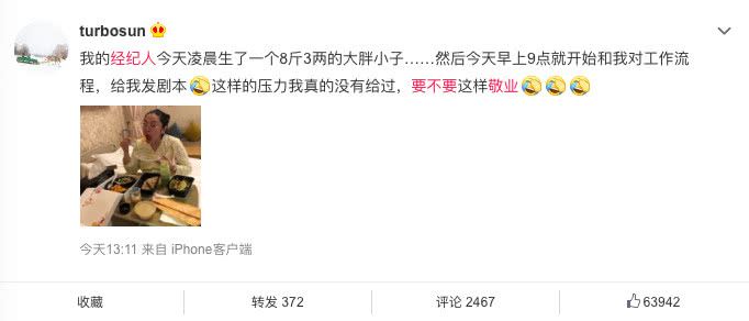 今天下午一点,孙俪就在微博上发文表示经纪人太敬业。她在微博里提到,经纪人思思是在凌晨的时候生了一个大胖小子,然而就在早上九点的时候就已经开始跟孙俪对接工作,还把剧本发给孙俪。这简直是生孩子也不想休息的节奏~