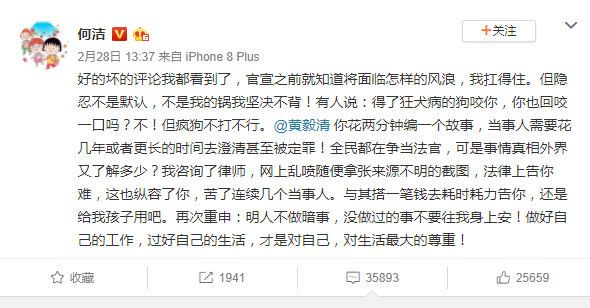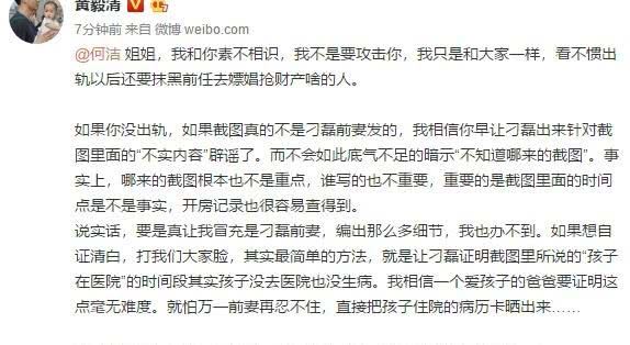 面对网上的吐糟和谩骂声,何洁终于坐不住,微博发文回应:隐忍不应该被当做是默认,不是自己的锅所以不能背。还@黄毅清,将其比喻为疯狗。最后重申,明人不做暗事,没做过的事不要往我身上安!做好自己的工作,过好自己的生活,才是对自己,对生活最大的尊重!何洁的这番回应有点避重就轻,拿着黄毅清想把自己洗白,但她的话,网友们还信吗?