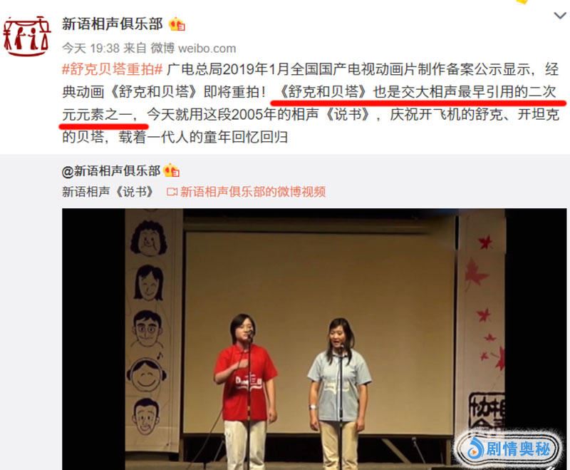 放下这个暂且不谈,这几天国产动画迷们听到了一个好消息,那就是从动画片制作备案信息得知,大家童年中非常喜欢的《舒克和贝塔》即将重拍,预计推出52集。按理来说,这个消息与李宏烨没有什么关系,但是他所在的新语相声俱乐部却在不久前发声,称《舒克和贝塔》是他们最早引用到相声里的二次元元素之一,并提供了14年前的一段视频为证。