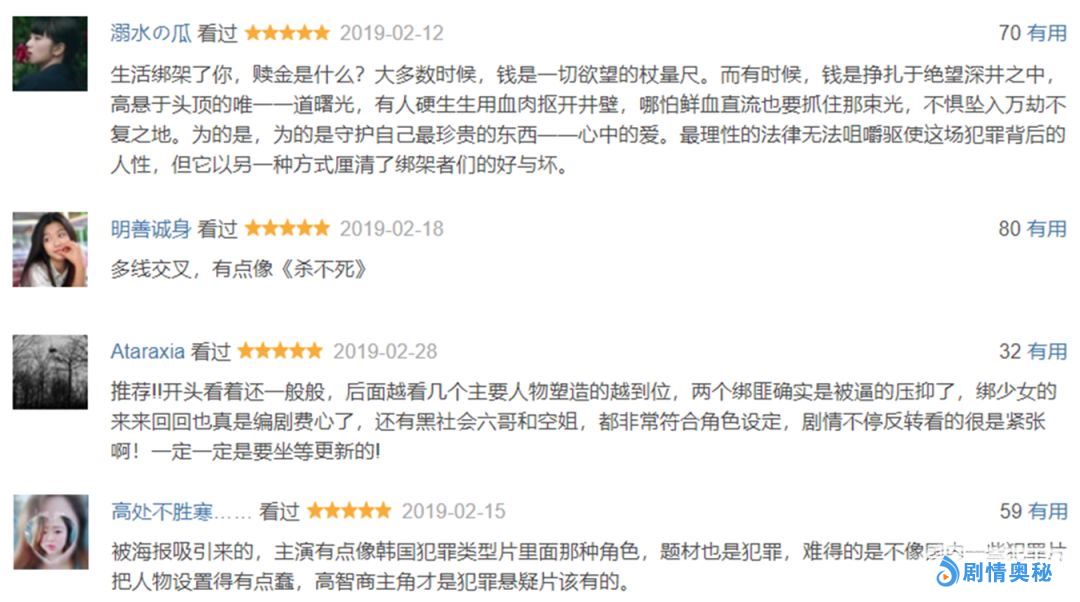 从目前的评论走向来看,喜欢它的观众将其奉为神剧,称它不弱于电影《无名之辈》。“立意不错,对人性的探讨也不错。”、“多线交叉,有点像《杀不死》”;