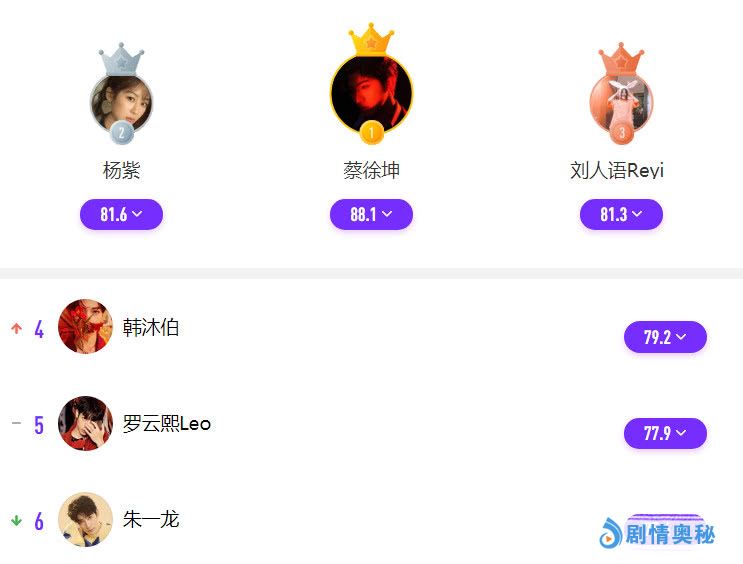 我们先看势力评分最高的六位艺人,他们依次是蔡徐坤、杨紫、刘人语、韩沐伯、罗云熙、朱一龙,其中势力指数高达88.1的流量明星蔡徐坤排第一,频频更新动态的杨紫居次席,第三刘人语和第四韩沐伯是新面孔,两位新生代流量明星的热度直线上升,不过对于他们来说,推出好作品才是立足娱乐圈的重中之重,排在之后的是实力派演员罗云熙朱一龙,背靠背的他们难分伯仲,前者正在全力以赴演绎《掮客》周小山,后者正在全力以赴演绎《盗墓笔记重启》吴邪。