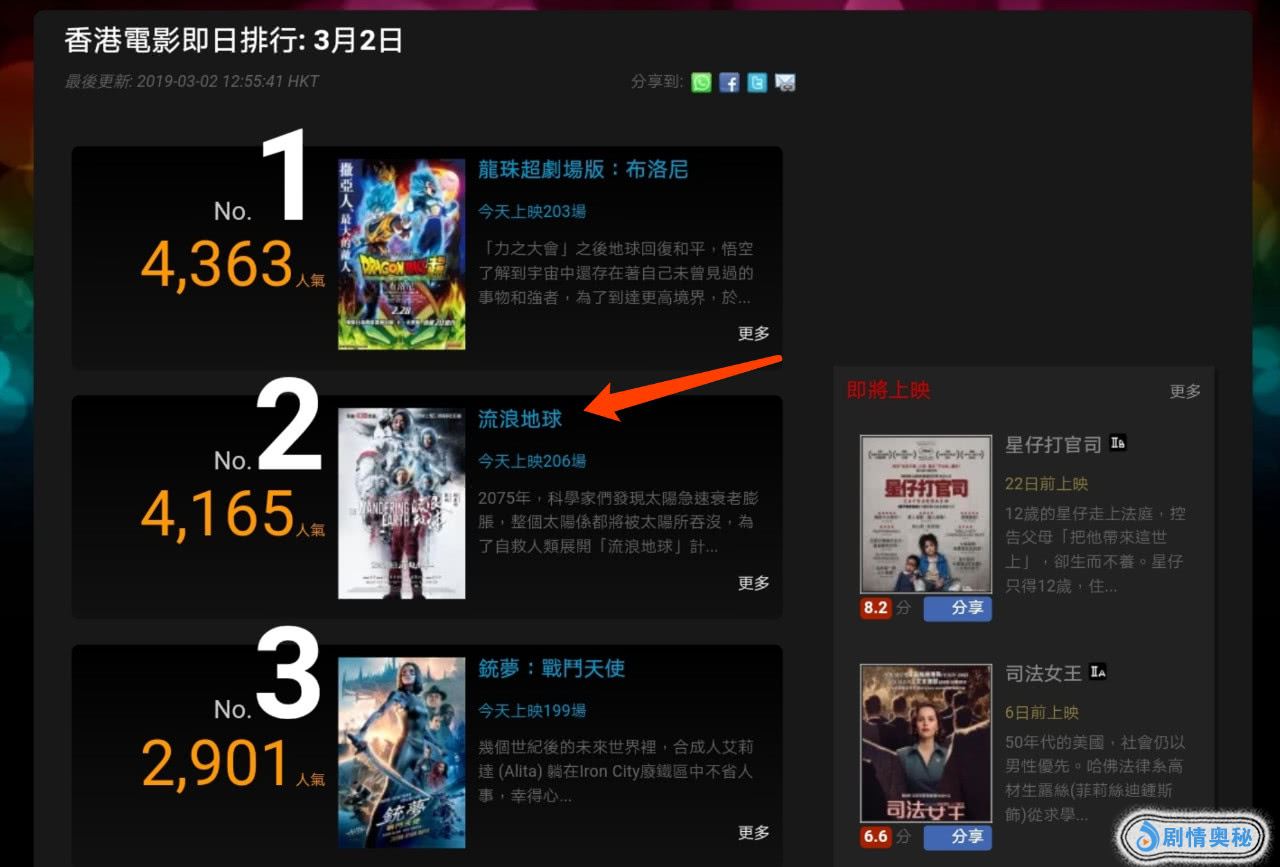从香港本土的当日影院票房排名来看,电影《流浪地球》表现不错,无论是人气、热度、满座率都是很高的,目前基本排名在第二,逆袭成冠军只是时间问题。
