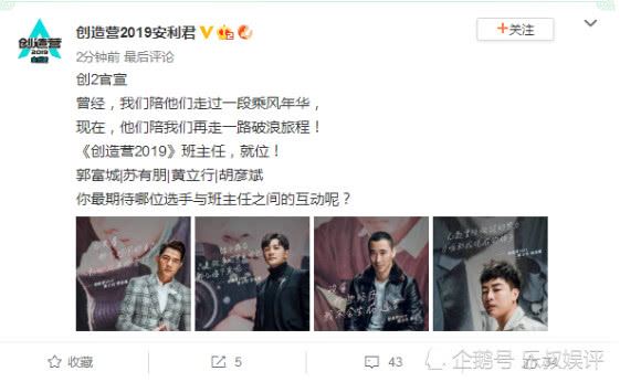 今日《创造营2019》的官微正式官宣了导师海报引了网友们的热议,《创造营》正式官宣了由郭富城、苏有朋、黄立行还有胡彦斌四人担任男团班主任。而迪丽热巴则是101男团的发起人。《创造营》官宣阵容火上了热搜,很多网友都觉得这次节目组为了收视率放大招了,郭富城作为“四大天王”之一有着相当高的地位,而且郭富城堪称“全能型”艺人,不仅唱歌好听而且还是“亚洲舞王”。最重要的是郭富城颜值还很高是80后90后的男神,如今他加盟《创造营》无疑是节目组的收视保障。
