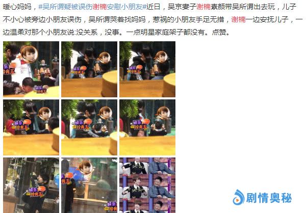吴所谓和其他小朋友玩得非常开心,但是小孩子之间总是少不了打闹,而且下手不知轻重,可能是在玩耍之中,吴所谓被其他的孩子误伤了。一下子哭了起来,钻到妈妈谢楠的怀里又哭又闹,而不小心误伤了吴所谓的另一位小朋友,也是站在一旁不知所措,感觉有些害怕。谢楠拍着吴所谓的肩膀,对他说没事没事,话语十分温暖。