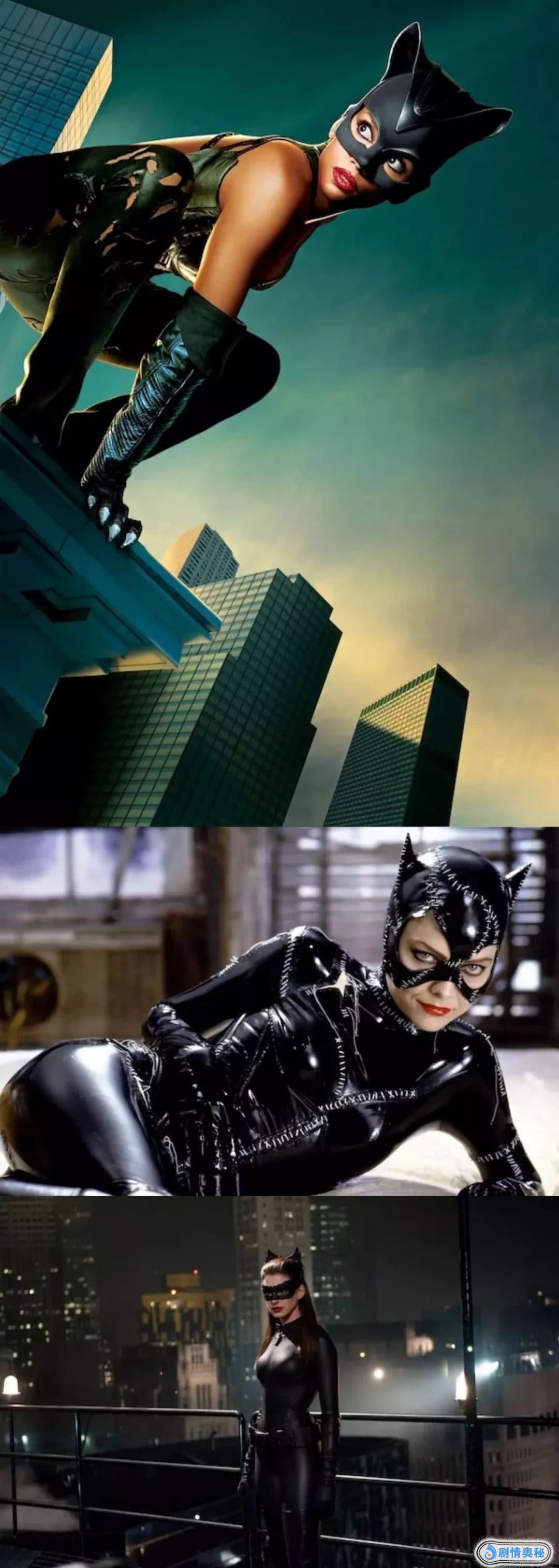 从上到下依次为《猫女》、《蝙蝠侠归来》、《蝙蝠侠:黑暗骑士崛起》中的猫女形象