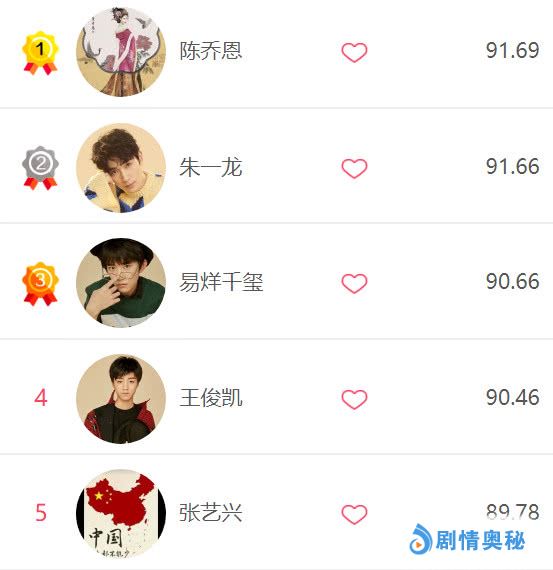 本期明星排名有大变动,目前热度评分最高的五位明星依次是陈乔恩、朱一龙、易烊千玺、王俊凯,以及张艺兴,其中领衔主演《独孤皇后》的陈乔恩凭借91.69的热度评分首次登顶,那个魅力男神居次席,我们可以看到朱一龙与陈乔恩的评分差距仅有0.03,两位优秀的电视演员难分伯仲,排在第三名和第四名的千玺和小凯热度评分双双破90,TFBOYS存在感十足。