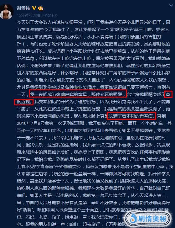 从谢孟伟发表的长文中可以看到,他也是从最美好的童年生活讲到了14岁走红之后的转变再到遇到老婆郭珊珊之后的一些经历。其中,在谈到成为家喻户晓的童星后的经历时,谢孟伟更多的讲到的则是成名之后给自己带来的伤害。